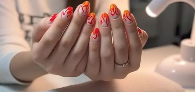Combine bold flame designs with heart shapes for an edgy romantic look. Featuring vibrant red and orange flames wrapping around delicate heart outlines. This manicure adds a fiery twist to any nail style. Perfect for those who want to express both passion and creativity.